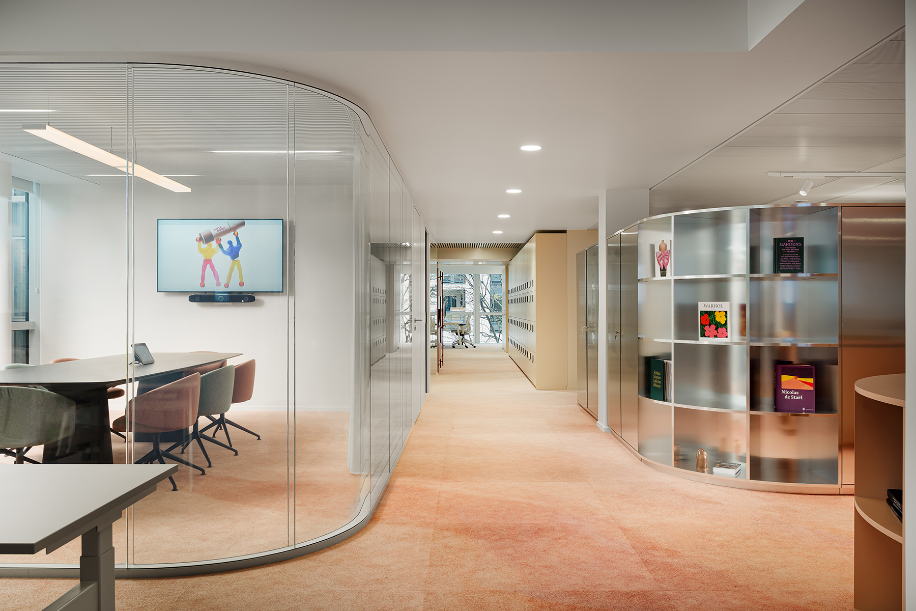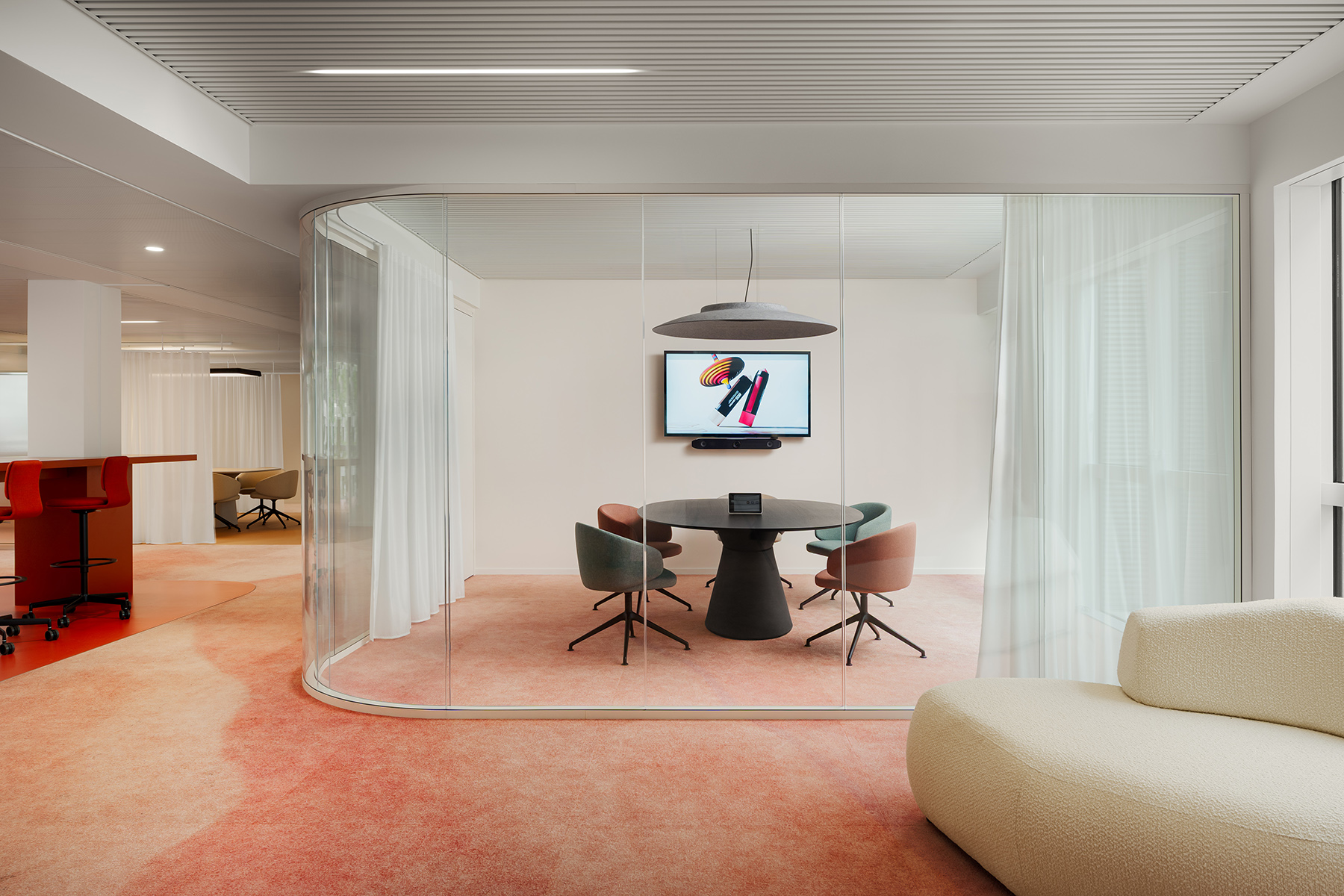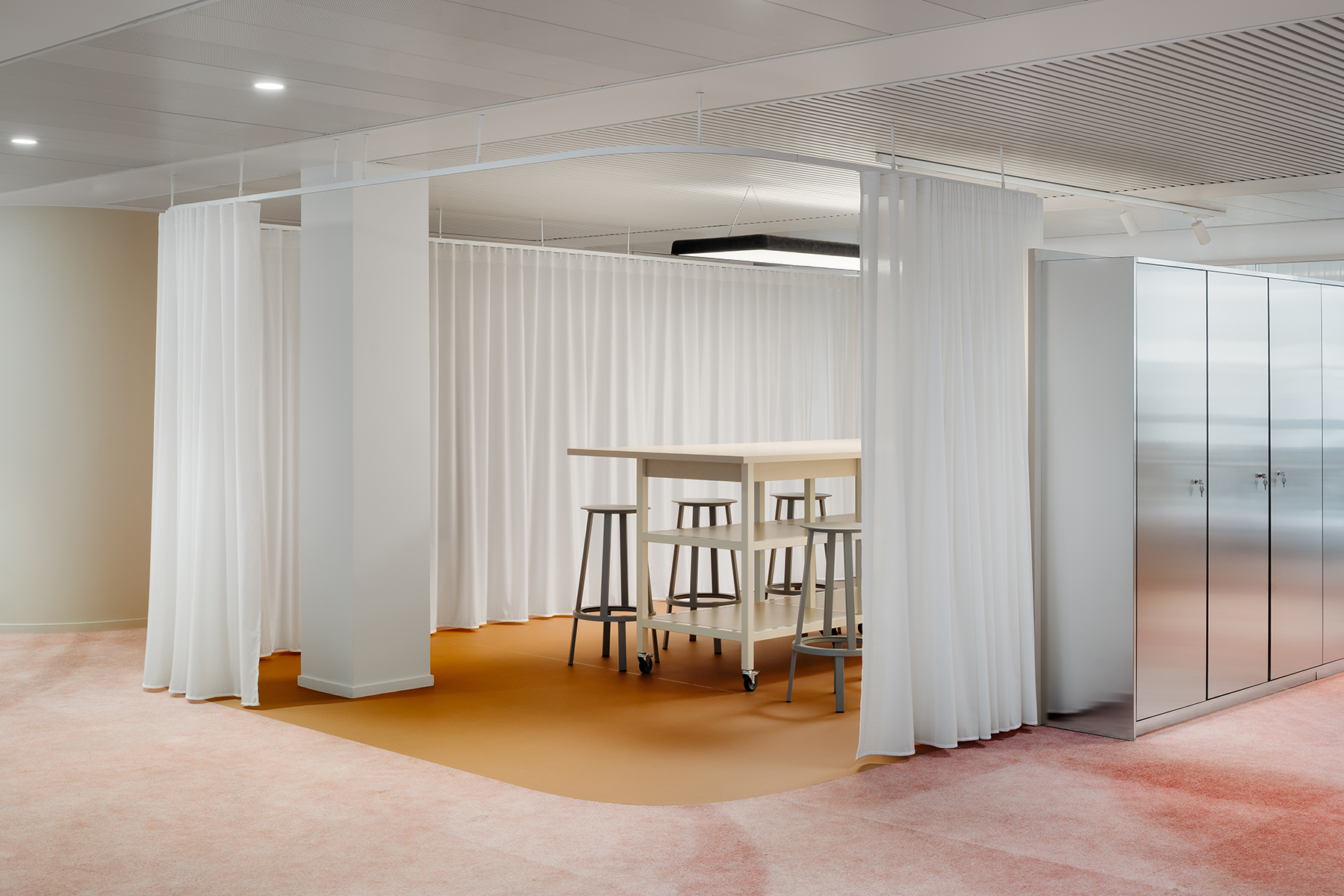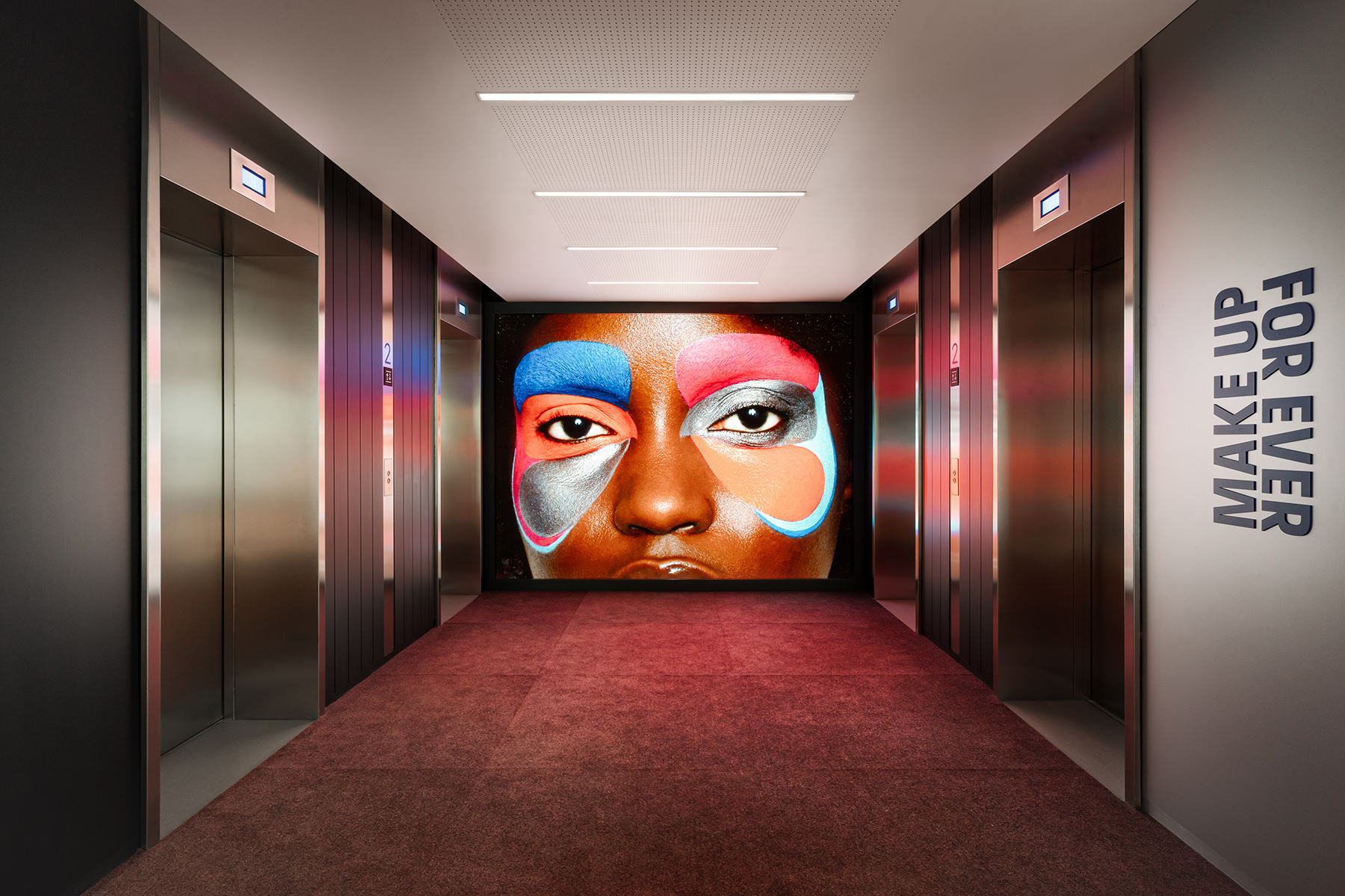 Le visiteur est dès son arrivée immergé dans l’univers de marque Make Up For Ever, avec un espace d’accueil l’incarnant. Il accède ensuite au coeur collaboratif de l’espace : le make up warehouse, autour duquel rayonnent des espaces de travail alternatifs tels que les espaces métiers et les salles de réunions, puis les zones plus réservées tels que les bureaux ou les box. Une stratégie vivante et adaptée aux postures nomades que requiert le passage à un espace de travail partagé.